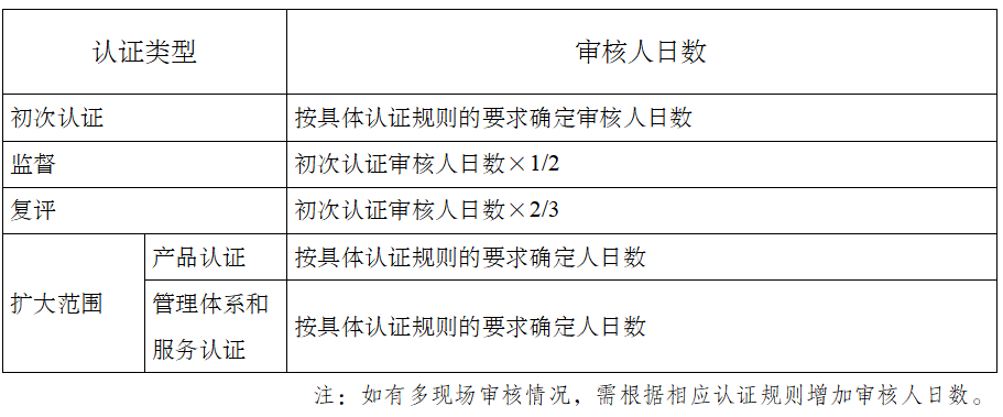 认证审核的人日数与申请认证的产品单元、被认证组织的总人数、审核类型(初评、复评、复查和监督)、服务内容、管理体系运行情况等因素相关。人日数包括文件评审、现场审核等的时间, 不包括路途时间、合同评审等所花费的时间。