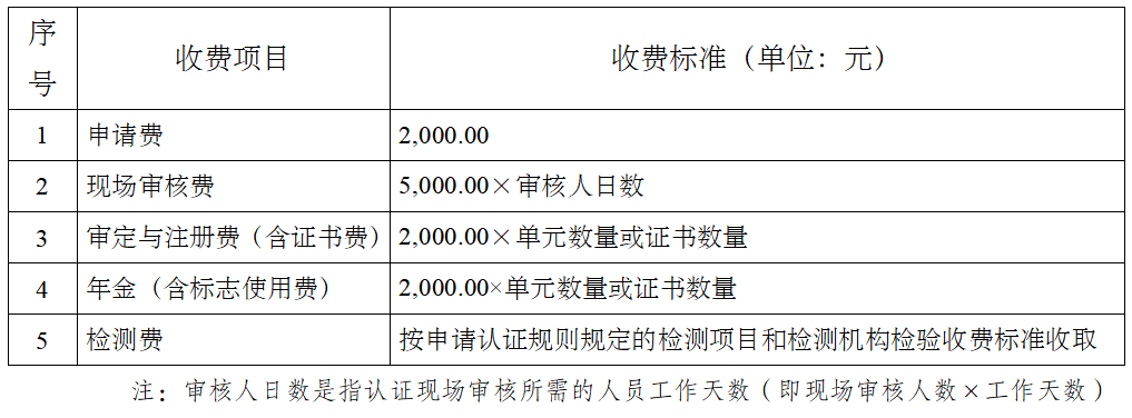 收费项目和标准按照《国家计委国家质量技术监督局关于印发产品质量认证收费管理办法和收费标准的通知》的规定制订。认证审核的工作量(人日数)主要根据申请认证组织申请认证单元数量、适当考虑企业规模,按国际准则及国家认可委的要求确定。